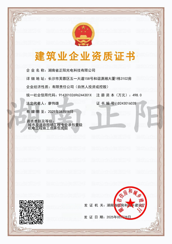 2025年5月28日,經(jīng)湖南省住房和城鄉(xiāng)建設(shè)廳審核批準(zhǔn),湖南省正陽光電科技有限公司成功獲得“機(jī)電工程施工...